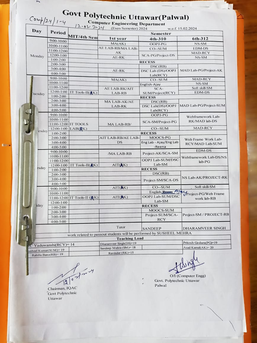 You are here : Home / Departments/Courses » Computer Engineering Department » Time Table, Lesson Plan for Academic Session 2023-24 (Even Semester)